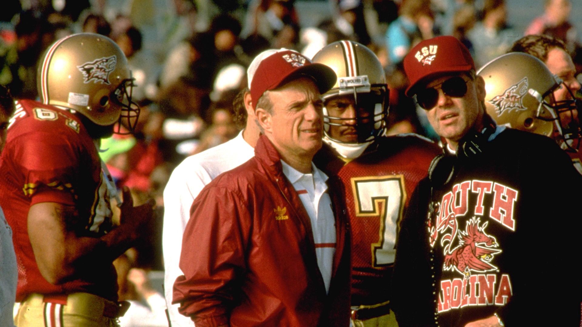 You can’t get much further from the hip-hip-hooray tone of “Rudy” than “The Program,” which arrived in theaters just three weeks prior to “Rudy” in the fall of 1993. Director and co-writer David S. Ward embraces some upbeat college football-movie clichés—but also explores the dark side of the sport, with plotlines about wealthy alumni, athletes receiving special treatment in the classroom, alcoholism, and the use of anabolic steroids. (When two assistant coaches witness a roided-up lineman smashing in car windows with his head, they opt not to tell the head coach, but to warn the player about upcoming testing, so he can figure out a way around it.) Like his “Godfather” brother Al Pacino in “Any Given Sunday,” the great James Caan brings a growling, paternal authenticity to the role of the head coach, and the supporting cast features a number of bright young talents, including Halle Berry, Craig Sheffer, Kristy Swanson, and Omar Epps.